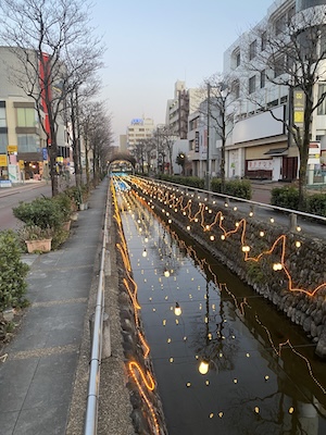 コンサートの帰り水路を飾る黄昏時のネオンが